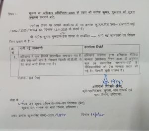 दरअसल सोहना के एक व्यक्ति द्वारा 29 अक्टूबर 2025 को महानिदेशक चंडीगढ़ से सूचना का अधिकार अधिनियम 2005 के तहत सूचना जनसपंर्क एवं भाषा विभाग हरियाणा के कार्यालय से रजिस्टर्ड पोस्ट के ज़रिए जिन छः बिंदुओं पर जानकारी मांगी गई थी वह इस प्रकार है।