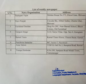 2:-हरियाणा जनसम्पर्क विभाग द्वारा कितने साप्ताहिक समाचार पत्रों को विज्ञापन सूची में शामिल किया गया है,ओर उनके क्या-क्या नाम है और कहा-कहा से प्रकाशित किए जा रहे है।
