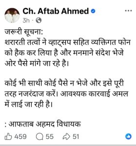 हैकरों ने नूंह विधायक आफताब अहमद का फोन किया हैक-