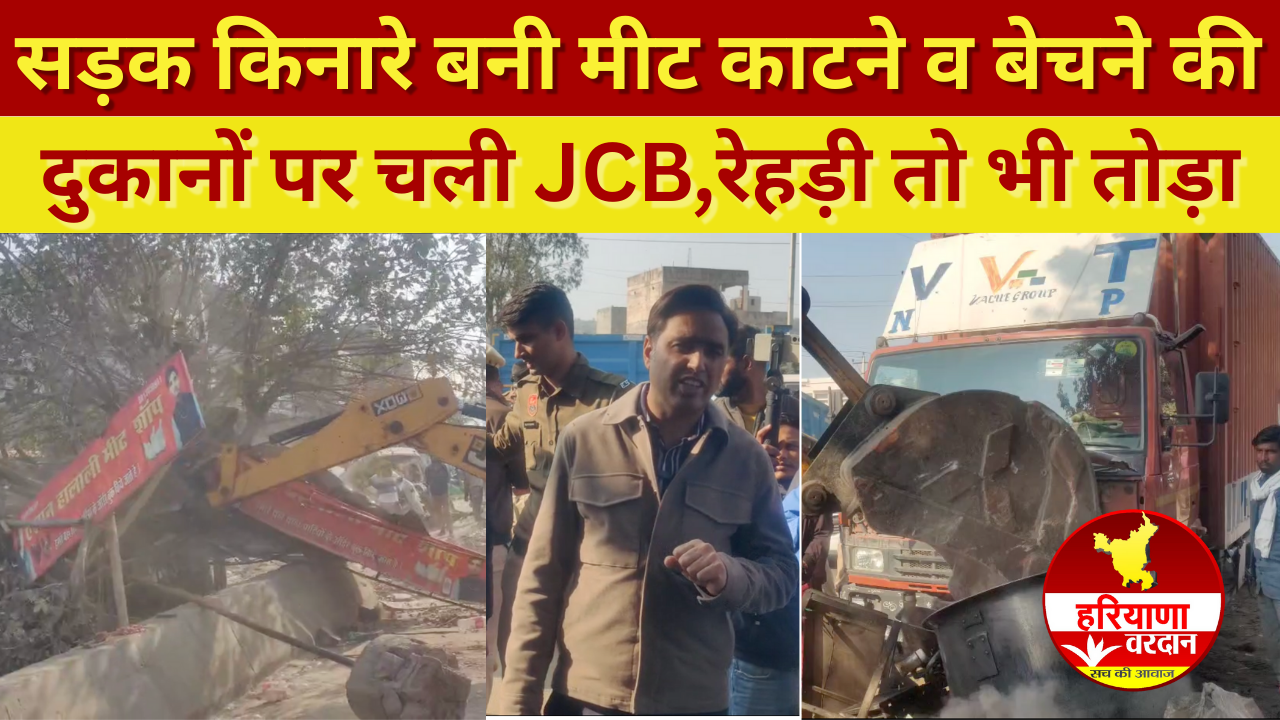सोहना नूह सड़क मार्ग पर अवैध रूप से सड़क किनारे बनी मीट काटने व बेचने की दुकानों पर धावा बोलते हुए उन्हें जेसीबी की मदद से जमीदोष ही नही किया बल्कि चिकन बिरयानी बेचने वाली रेहड़ी व उस पर रखे पतीला को भी चकनाचूर कर दिया।