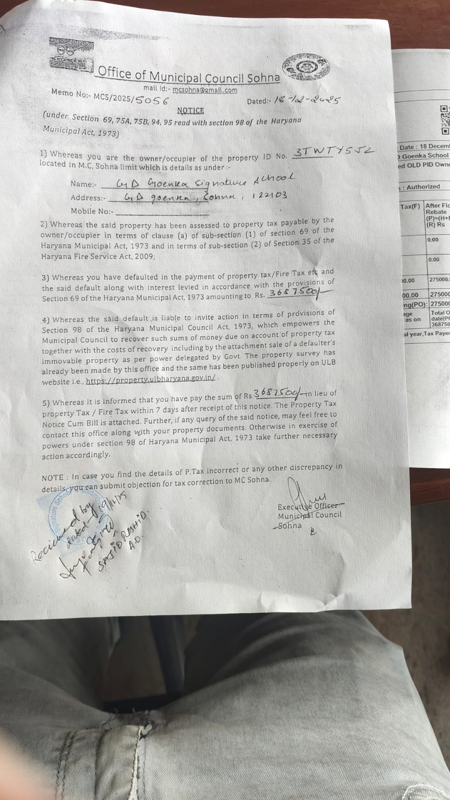 सोहना नगर परिषद ने करोड़ों के बकाया प्रॉपर्टी टैक्स को वसूलने के लिए कवायद शुरू कर दी है।जिस कवायद के तहत नगर परिषद ने टैक्स वसूलने के लिए नोटिस जारी करने शुरू कर दिए है।अगर हम नगर परिषद के कार्यकारी अधिकारी सुमनलता की माने तो 31 मार्च 2026 प्रॉपर्टी टैक्स जमा कराने की अंतिम तारीख है।अगर इससे पहले टैक्स जमा नही किया जाता है,तो कुल प्रोपर्टी की राशि पर 18 प्रतिशत की दर से ब्याज भी देना होगा।